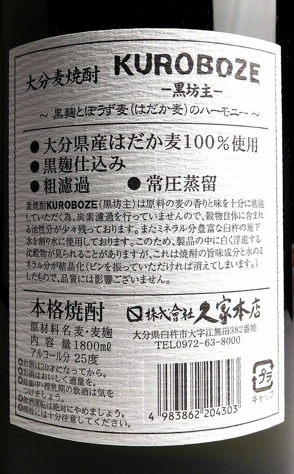 KUROBOZE(くろぼうず)25度1800ml 【久家本店】《麦焼酎》